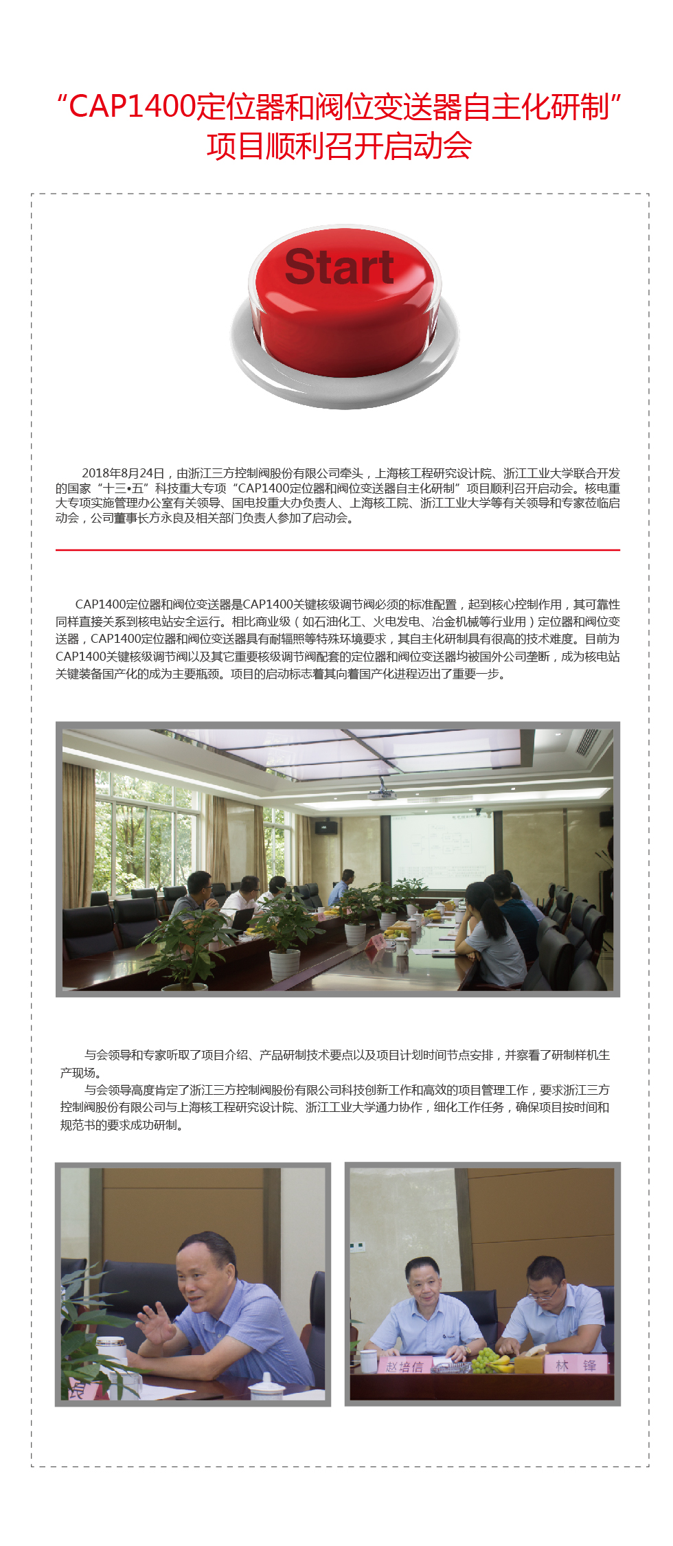 2018年8月24日,由浙江三方控制閥股份有限公司&ldquo牽頭,上海核工程研究設計院、浙江工業(yè)大學聯(lián)合開發(fā)的國家“十三•五”科技重大專項“CAP1400定位器和閥位變送器自主化研制”項目順利