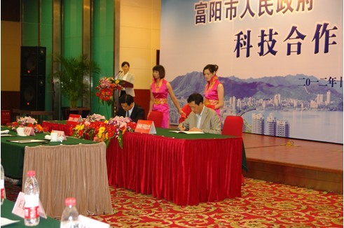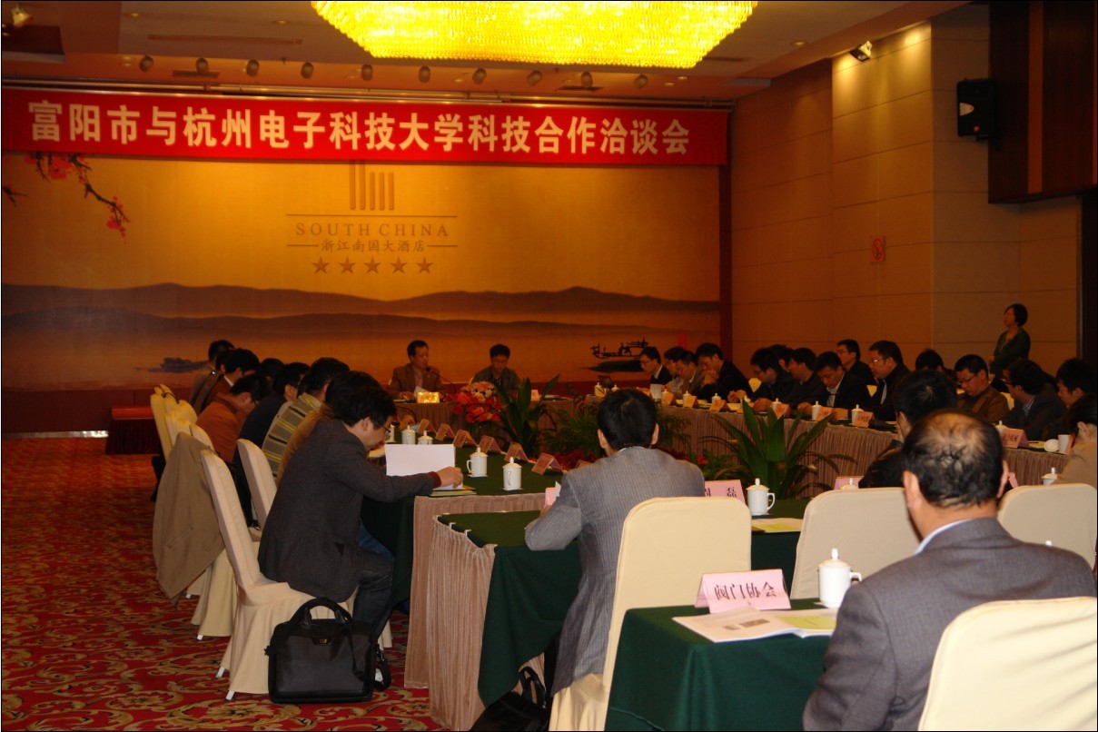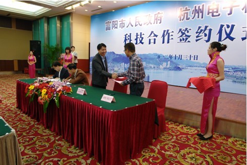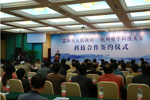 (富陽(yáng)市委副書(shū)記、市長(zhǎng)章舜年與杭州電子科技大學(xué)校長(zhǎng)薛安克簽約儀式現(xiàn)場(chǎng))