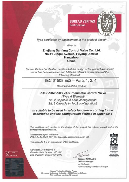 近日,我公司浙江三方控制閥股份有限公司成功獲得了由法國BV國際認證